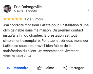 "Un grand merci à Timothée pour son professionnalisme. Installation d'une climatisation réversible. Il a su nous conseiller au mieux sur le choix du produit performance/budget/esthétique. Pose et mise en main soignées. Je recommande vivement".
